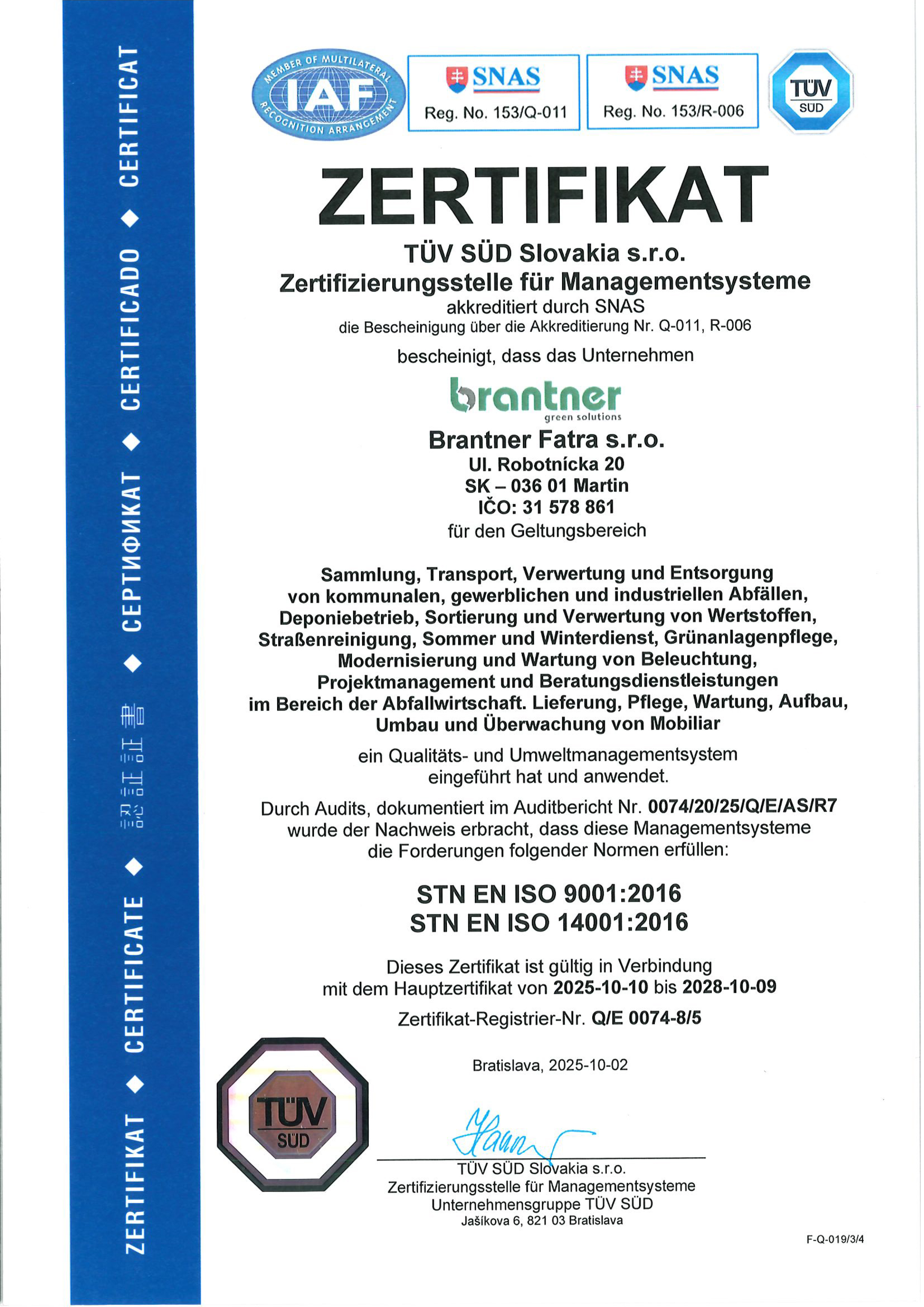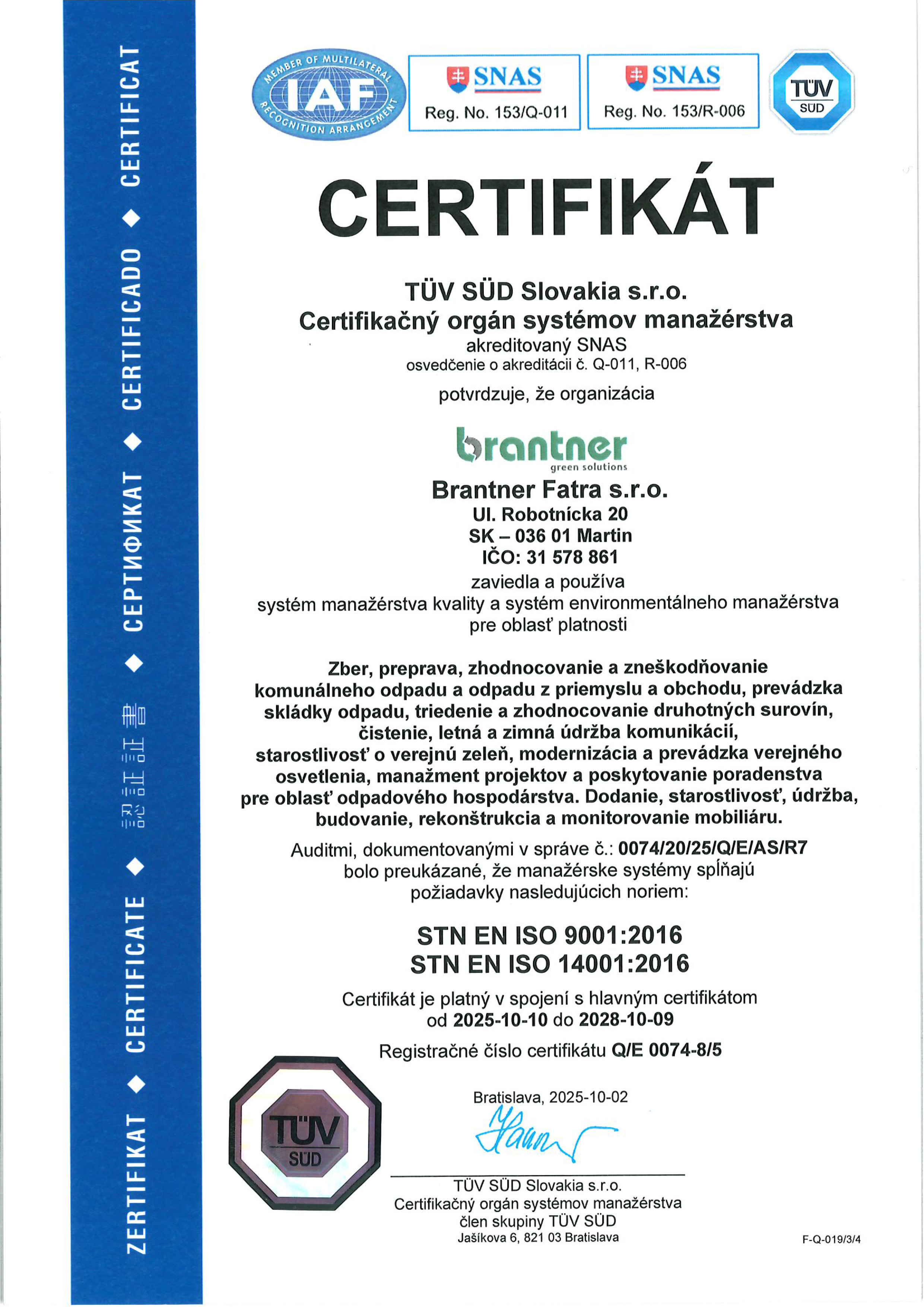 Certifikát systému manažérstva kvality a systému environmentálneho manažérstva vydaný nezávislou certifikačnou spoločnosťou TÜV SÜD Slovakia preukazuje, že zavedený systém je naďalej udržiavaný v súlade s požiadavkami príslušných noriem, je zárukou profesionality a pozitívnym signálom kvality pre našich zákazníkov.